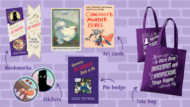 Magnificent tote bags! Stickers! Bookmarks! Pin Badges! Art Cards!